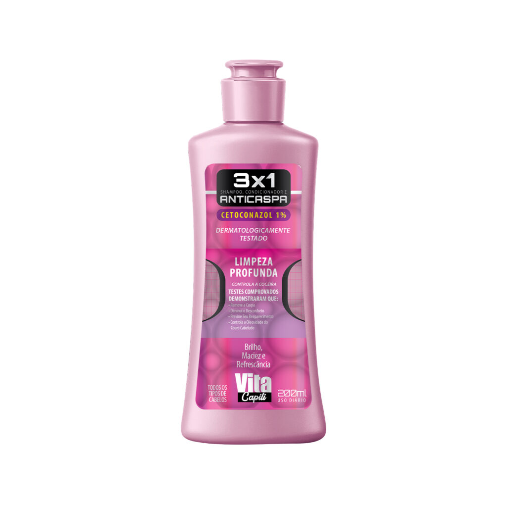 O Shampoo e Condicionador Vita Capili 3×1 + Anticaspa Limpeza Profunda oferece uma limpeza eficaz e intensa do couro cabeludo, eliminando impurezas, excesso de oleosidade e combatendo a caspa com o ativo CETOCONAZOL 1%. Sua fórmula conta ainda com própolis e alantoína, que acalmam e protegem a pele, reduzindo a irritação e o desconforto.