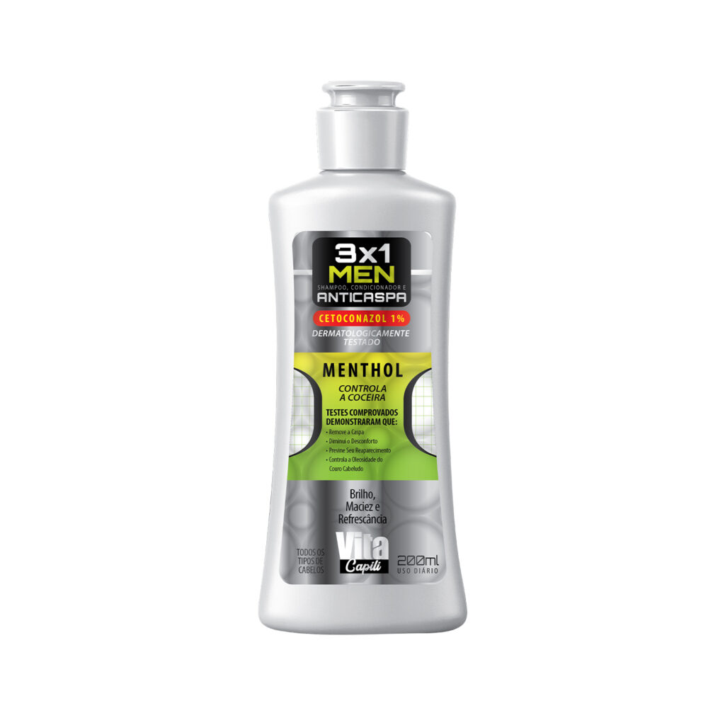 O Shampoo e Condicionador Vita Capili Men 3×1 + Anticaspa Menthol une a eficácia do CETOCONAZOL 1% no combate à caspa com a refrescância e sensação de frescor proporcionadas pelo mentol. Sua fórmula também contém própolis e alantoína, que protegem e hidratam o couro cabeludo, ajudando a reduzir a oleosidade e o desconforto.