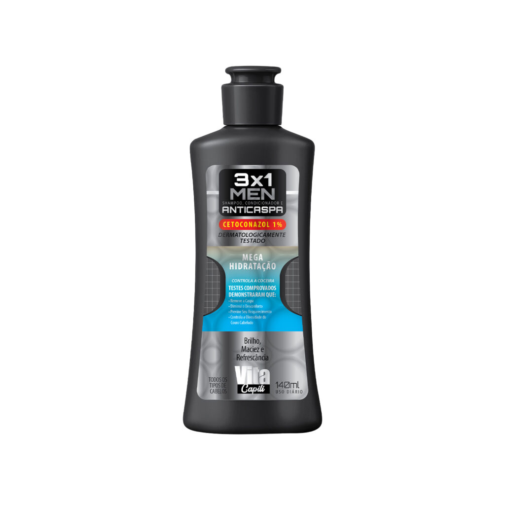 O Shampoo e Condicionador Vita Capili Men 3×1 + Anticaspa Tradicional foi desenvolvido para oferecer limpeza eficaz, condicionamento e ação anticaspa em um único produto prático. Sua fórmula contém CETOCONAZOL 1%, ativo potente no combate à caspa, além de ingredientes que controlam a oleosidade e aliviam o desconforto do couro cabeludo.