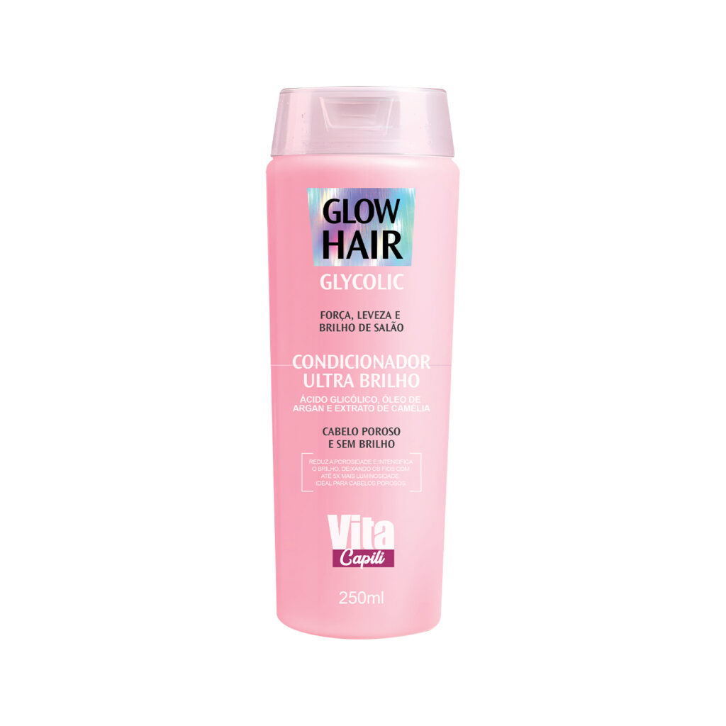 O Condicionador Ultra Brilho Glow Hair Glicolic da linha Vita Capili complementa o cuidado dos fios com uma fórmula que hidrata, desembaraça e intensifica o brilho natural dos cabelos. Enriquecido com ativo glicólico, ajuda a alinhar as cutículas capilares, proporcionando um efeito luminoso e toque extremamente macio.