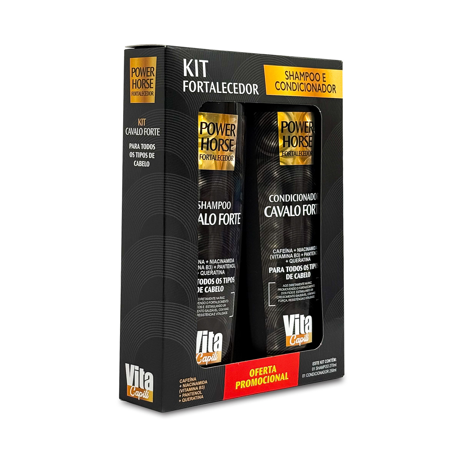 O Kit Cavalo Forte Power Horse Fortalecedor da linha Vita Capili, composto por Shampoo 270 ml e Condicionador 250 ml, foi inspirado nos tratamentos de fortalecimento intensivo para proporcionar cabelos mais fortes, longos e resistentes. Sua fórmula poderosa promove uma limpeza suave enquanto fortalece a fibra capilar, ajudando a reduzir a quebra e estimulando o crescimento saudável dos fios.